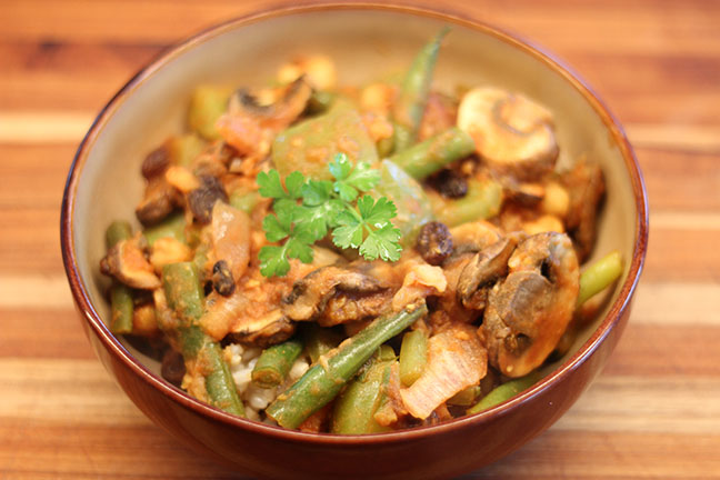 Add the broth, green beans, mushrooms, and chickpeas and bring to a boil. Reduce the heat to low, cover and simmer until the vegetables are tender, about 20 minutes. Stir in the parsley, lemon and raisins and cook 5 minutes longer. Taste to adjust the seasonings and serve.