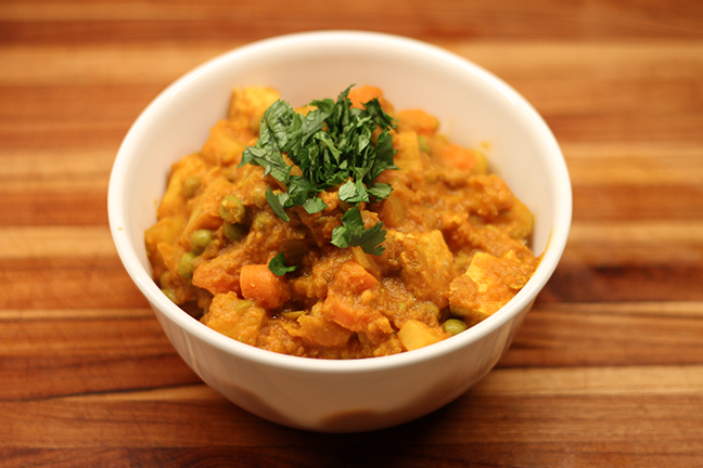 Add the coconut cream, the remaining 1/2 cup of water, the garam masala and cilantro. Mix to incorporate the coconut cream. Stir in the cooked potatoes, carrots and peas. Add chickpeas and tofu if using. Bring to a simmer and serve warm as a rich stew or paired with rice.